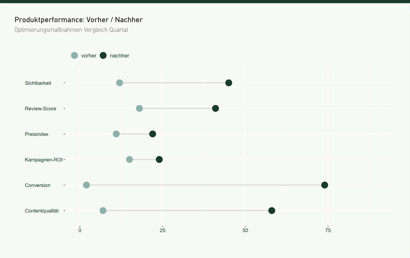 Um zu verstehen, was funktioniert hat und was nicht, braucht es die richtigen Dimensionen dazu: Content-Qualität, Preisposition, Sichtbarkeit, Wettbewerbsaktivitäten, Traffic-Quellen. Erst in ihrer Kombination entsteht ein Bild, aus dem sich konkrete Maßnahmen ableiten lassen.
